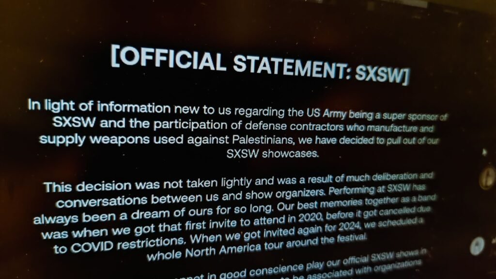 Band asal Indonesia Reality Club mengumumkan untuk mundur dari festival musik South by Southwest Music Festival (SXSW) yang berlangsung di Austin, Texas, Amerika Serikat. Melalui Official Statement di Instagram mereka @realityclub, pengunduran diri mereka pilih sebagai bentuk solidaritas terhadap Palestina yang kini tengah menghadapi aksi genosida melawan Israel. Kehadiran tentara angkatan darat Amerika Serikat sebagai sponsor dalam festival SXSW menjadi alasan utama batalnya aksi konser mereka.